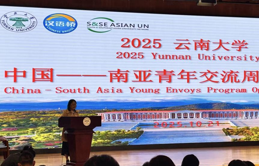 2025年10月21日上午,由教育部中外语言交流合作中心、云南省教育厅主办,云南大学承办的2025年中国——南亚青年交流周暨“汉语桥”孟加拉国青年访华交流营在云南大学科学馆一楼报告厅举行开营仪式。来自孟加拉国、巴基斯坦、印度、尼泊尔等国多个高校的60余名青年学生参加活动。